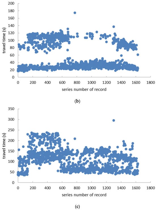 As shown in Figure 7, the travel times between adjacent detection sections exhibit different variation characteristics. The travel time between two adjacent upstream sections is influenced by the signal control cycle of the intersection and includes red light waiting and queuing times. This characteristic is more obvious in the downstream adjacent sections and follows a layered distribution. The travel time distribution from the starting point detection section to the end point detection section shows a complex increasing and decreasing trend.