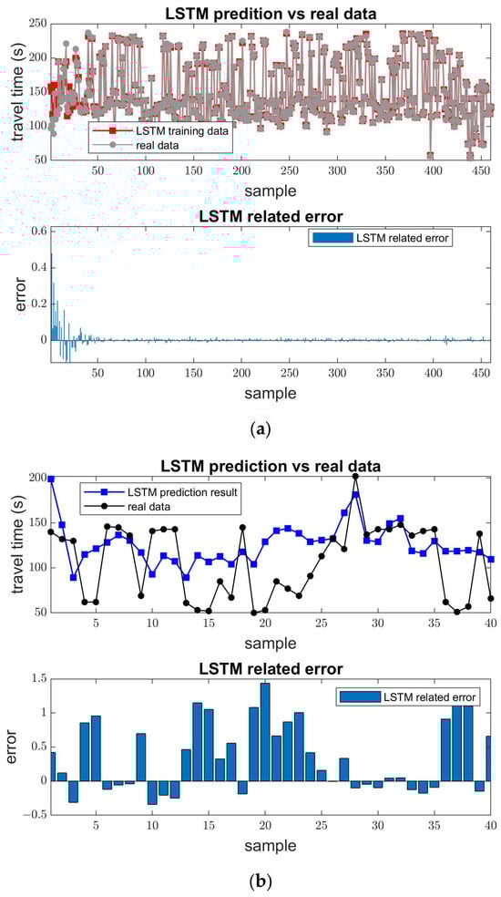 (a). Training results from LSTM for travel time parameters. (b) Prediction results from LSTM for travel time parameters.