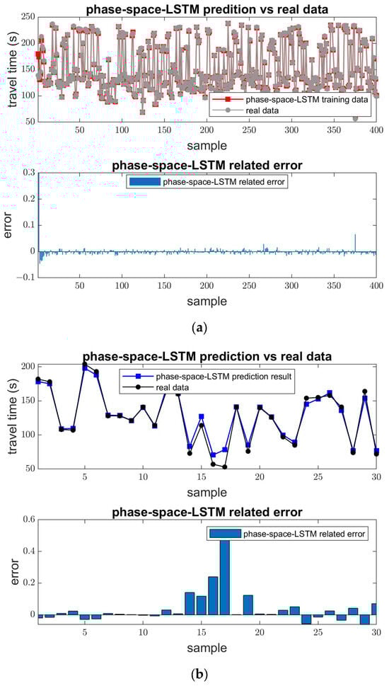 (a) Training results from LSTM with phase space reconstruction for travel time parameters. (b) Prediction results from LSTM with phase space reconstruction for travel time parameters.