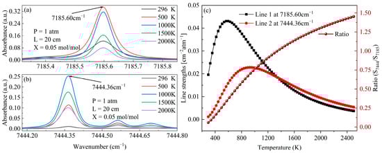 In hydrocarbon flames, water vapor, the main product of the combustion process, absorbs strongly in the near-infrared region. Therefore, water vapor was chosen as the target absorbing species in both simulations and experiments. Two absorption spectra, centered at v1 = 7185.6 cm−1 and v2 = 7444.36 cm−1, were used in this work because of their moderate line intensities and good temperature sensitivity. The specific parameters of the two chosen spectral lines can be combined with the HITRAN database [30]. The absorbances of the two spectral lines at different temperatures are given in Figure 2a,b, and the line intensities and intensity ratio of the two spectral lines are depicted in Figure 2c.
