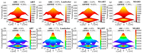 In this section, the effect of different noise levels on the reconstruction of non-axisymmetric temperature and concentration distributions is analyzed to assess the robustness of the algorithms under such conditions. In industries, non-axisymmetric distributions do occur. Figure 10 depicts the reconstruction results of the temperature and concentration fields with non-axisymmetric distributions using the four algorithms. Similar to the conclusion drawn with the axisymmetric distributions, the MIARO algorithm achieved the best results with the smallest error and the mildest fluctuations at the edges of the field.