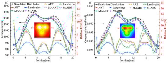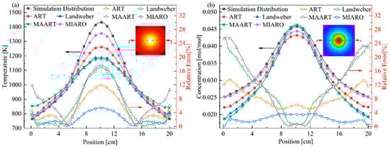 Taking a cross-section at y = 14 cm, where temperature peaks appear when using the axisymmetrical settings, the reconstruction results over this plane are shown in Figure 11. Comparing the different algorithms, it can be found that the temperature and concentration reconstruction errors with the MIARO algorithm are much smaller than those obtained with the other algorithms. In fact, the maximum error of temperature is within 8%, the error for concentration is within 6%, and the fluctuations at the edges of the cross-section are lower than those obtained with the other algorithms, which further proves the superiority of MIARO.