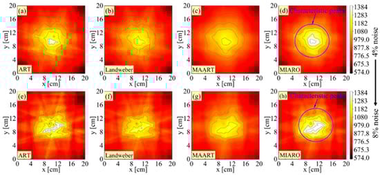 Often, in complex combustion flame parameter tests, the acquired signals are inevitably affected by mechanical vibrations and thermal radiation in the flame. Photodetectors are also subjected to calibration errors. In order to evaluate the performance of the system in noisy environments, 2%, 4%, 6% and 8% uniform noise levels were added to the LOS measurements A to study and analyze the stability of the MIARO algorithm in complex combustion field reconstruction applications [31,32].