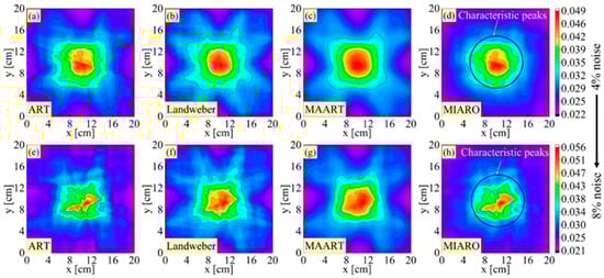 To evaluate the performance of the reconstruction algorithm in noisy environments, uniform noise signals of 2%, 4%, 6% and 8% were added to the LOS measurement A database for simulations. Figure 6 and Figure 7 show the temperature and concentration reconstruction results with the different levels of added noise. As can be seen in Figure 6, the characteristic peaks can be clearly identified in the temperature reconstruction results with 4% noise for all algorithms. The contour lines in the figure reveal that with the MIARO algorithm, the high-temperature region is better presented, while for the other tested algorithms, the reconstructed fields become flattened around this region to some extent. At the 8% noise level, the reconstruction results with MIARO still show obvious characteristic peaks, and the edge fluctuation is smaller. From the concentration reconstruction results, similar conclusions can be drawn. The fluctuations in the reconstructed distribution are more severe with increased noise levels, especially at the edge of the targeted region. Using the ART, Landweber and MAART algorithms, artifacts at the edges under the influence of noise are much more significant. The MIARO algorithm can still be used to achieve better reconstruction results even with a lower signal-to-noise ratio, showing its robustness.