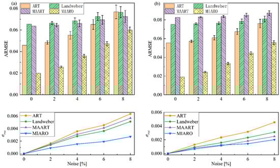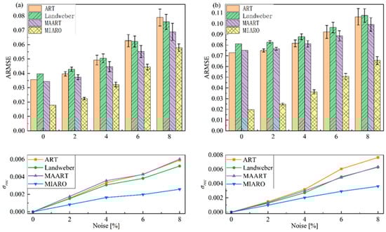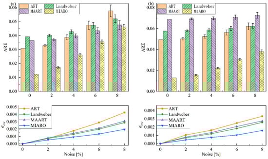 In order to achieve the quantitative validation of the MIARO algorithm, two criteria, ARE and ARMSE, were used to compare the aforementioned four algorithms with added noise at different intensities. The results are shown in Figure 8 and Figure 9, where 100 repeated measurements were taken for each algorithm at a given noise level. In Figure 8 and Figure 9, it can be seen that with 2%, 4%, 6% and 8% random noise levels for all four algorithms, both the average error and standard deviation rise with the increase in noise. The overall trend of ARE is the same as that of ARMSE, although the ARMSE values are generally higher than ARE.