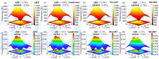 Temperature and concentration field reconstruction results and errors for different algorithms non-axisymmetric model: (a,b) ART iterative algorithm, (c,d) Landweber iterative algorithm, (e,f) MAART iterative algorithm, (g,h) MIARO iterative algorithm.