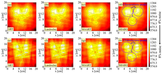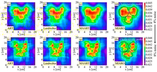 To further assess the noise immunity of the reconstruction algorithm for complex distributions, random noises at levels of 2%, 4%, 6% and 8% were applied to the LOS measurement A database again. Figure 12 and Figure 13 show the reconstructed temperature and concentration at 4% and 8% noise levels. The characteristic peaks are clearly visible in the temperature reconstruction results for all four algorithms at the 4% noise level, but only with the MIARO algorithm are the characteristic peaks in the concentration reconstruction distinguishable. At the 8% noise level, only MIARO provides recognizable characteristic peaks in the reconstructed results, showing the robustness of this algorithm over the other three.