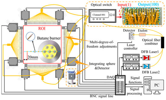 The diagnosis of combustion processes is a vital tool for both scientific research and industrial applications. Over the years, various techniques have been devised and implemented for this purpose. Acoustic thermometry (AT) [1,2,3,4], coherent anti-Stokes Raman scattering spectrometry (CARS) [5], planar laser-induced fluorescence (PLIF) [6], radiation thermometry [7,8] and laser absorption spectroscopy (LAS) are examples of such techniques [9,10]. As a typical non-contact measurement method, tunable diode laser absorption spectroscopy (TDLAS) has many advantages, such as a fast measurement response, high accuracy, high sensitivity, the simultaneous measurement of multiple parameters, etc. TDLAS has been widely used in combustion diagnostics and trace-gas detection, and its performance is particularly demonstrated when multiple-parameter measurement is required. A more recent development in this field is the tunable diode laser absorption tomography (TDLAT) technique [11,12], which combines the TDLAS technique and the computed tomography (CT) technique. TDLAT has been gradually developed and has been widely applied [13]. By detecting the spectral data for multiple angles and laser paths through the measured field, combined with image reconstruction algorithms, the visualization of temperature and component concentration distributions in complex combustion fields is achieved using TDLAT, which was used in the experiments in this research [14,15].