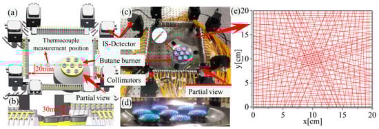 The 3D model and partial view of the butane torch burner experimental platform are shown in Figure 17a,b, and Figure 17c,d provide photographs of the experimental combustion flame and its focused view. Nine K-type thermocouples were spaced evenly (20 mm in between) over the same cross-section location. The measurements taken from the thermocouples were used as the temperature distribution references to evaluate the reconstruction accuracy of the proposed method. The field optical path arrangement is given in Figure 17e. The laser beam was arranged according to the optimal layout of the optical path for the field measurement. The overall test system can accommodate a multi-angle arrangement for 100 laser beams.