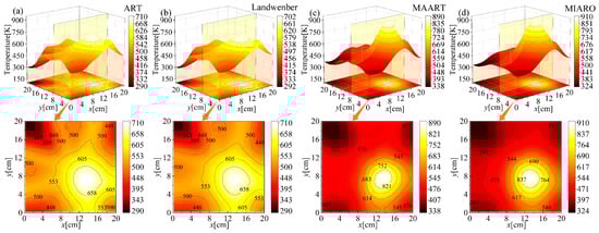Figure 18 shows the reconstruction results using the four different reconstruction algorithms for the temperature field generated with the butane burner. The upper part of the figure shows the 3D distribution of the reconstruction results, and the lower part of the figure shows the corresponding isothermal contour maps. In these figures, the peak value of the reconstructed flame distribution using the ART and Landweber algorithms is obviously low, and the fluctuations at the edge are more severe, whilst with MARRT and MIARO, the reconstructed images effectively represent the true temperature distribution in the high-temperature region. However, the MIARO algorithm performs better than MARRT in the flame’s center section.