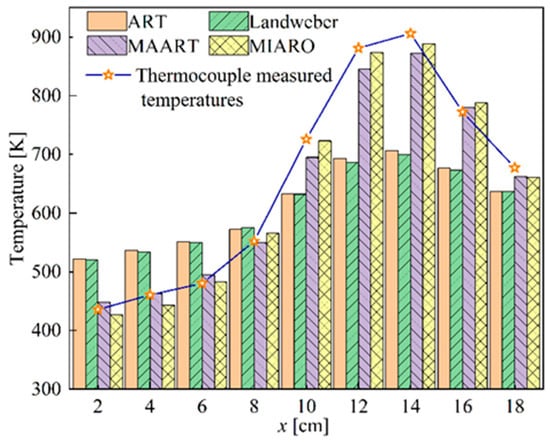 The temperature values obtained using different algorithms for the corresponding cross-section in Figure 18 are shown in Figure 19. The broken lines in Figure 19 represent the measurement results using the thermocouples. With the ART and Landweber algorithms, the constructed results become flattened in both high- and low-temperature zones over this cross-section, which does not truly reflect the flame distribution, whilst the reconstructed temperatures based on the MAART and MIARO algorithms are much closer to the thermocouple measurements. In fact, in general, the temperature reconstruction using MIARO has smaller deviations from the reference thermocouple measurements.
