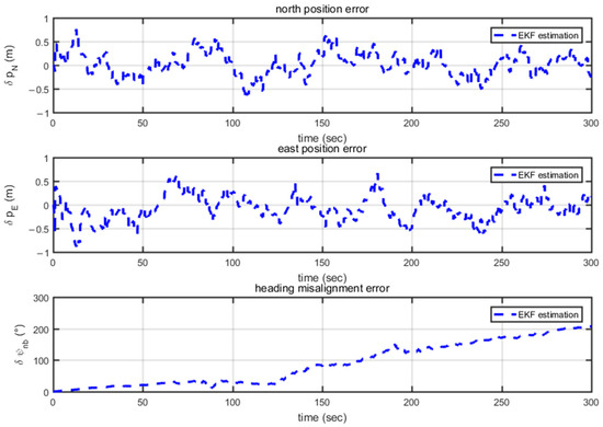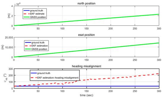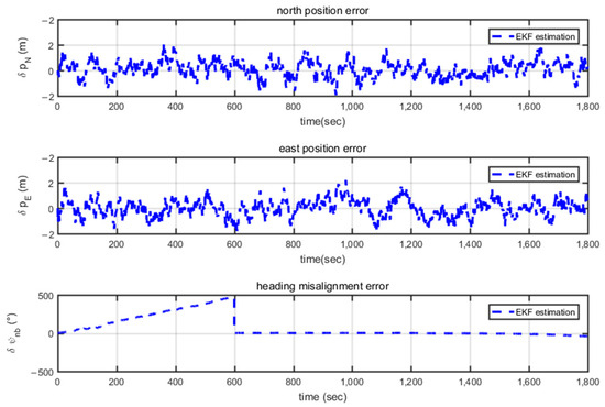 From Figure 11, it can be observed that, without heading assistance, position and velocity consistently converge. However, the heading misalignment angle rapidly di-verges in the first 600 s and approaches 180°. However, starting from 600 s, with GNSS velocity and heading assistance, not only is the heading misalignment angle estimated, as seen in Figure 12, but also the gyro bias quickly converges to around 0° as shown in Figure 13.