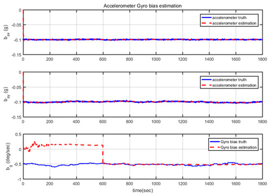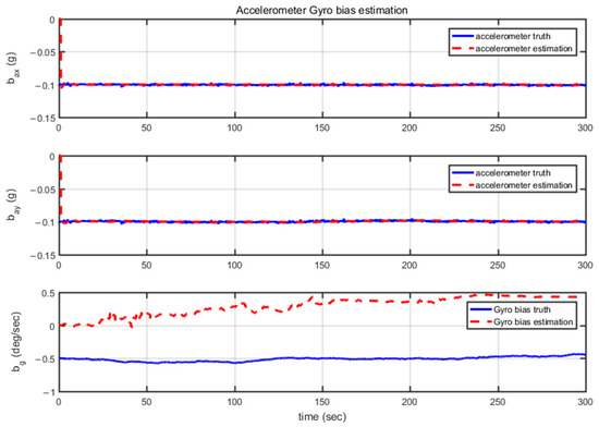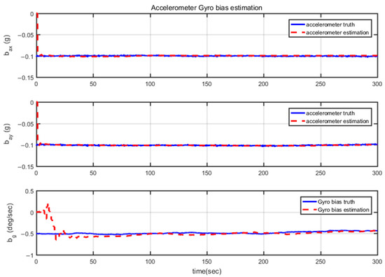 During 300 s of navigation time, the heading misalignment angle linearly diverges, confirming the earlier theoretical analysis that the heading is unobservable under a constant velocity straight-line motion. Figure 6 displays the estimated values of gyro and accelerometer biases. The accelerometer bias converges to the simulated setting of 0.1 g. However, under the condition of constant velocity straight-line motion, the gyro bias, which was initially set at 0.05°/s, diverges to nearly 0.05°/s within 300 s.