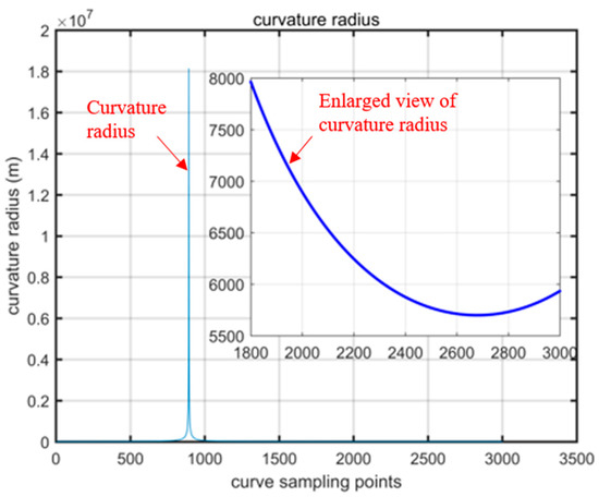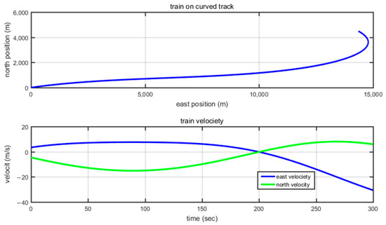 To further validate the observability of the train’s heading angle on curved tracks, simulations were conducted on a curved trajectory, with their corresponding trajectory and velocity shown in Figure 7. The minimum curvature radius is approximately 5500 m, as depicted in Figure 8, which complies with the high-speed rail’s minimum curvature radius requirements.