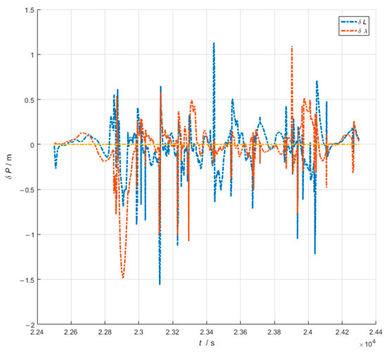 The data processing process, using the given true value attitude as the reference attitude and then loosely combining GNSS and SINS, provides the position error results as shown in Figure 16. Then, from Figure 17, it can be seen that the heading error is slowly diverging during the 250 s of the train’s travel in a straight line at a constant speed, and it converges after the train’s subsequent entry into the acceleration and deceleration maneuvering phase, and it remains steadily converging in the final phase due to the sustained cornering, even though during this phase, the train is travelling at a constant speed. As shown in Figure 18, the train’s heading is slowly diverging, and then converging after the subsequent acceleration and deceleration maneuvers and entry into the curved segment.