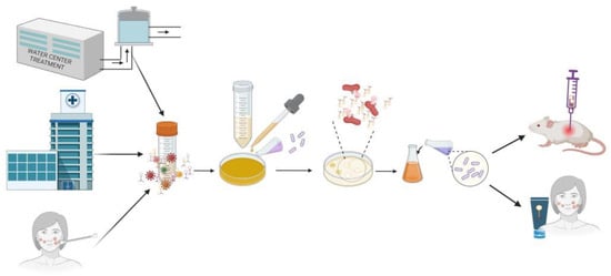 Phage isolation: phages can be collected from water center treatments, hospital facilities, lakes, and human samples. Afterwards, these phages are isolated and tested against different bacterial strains to assess the phages’ antimicrobial potential in specific strains. This specificity promotes a personalized therapy, as it allows it to be applied according to the patient’s specific microbiome. After proper analysis and validation, the phages of interest can be tested for different applications, such as antimicrobial drugs, drug delivery systems, and topical creams, for example.