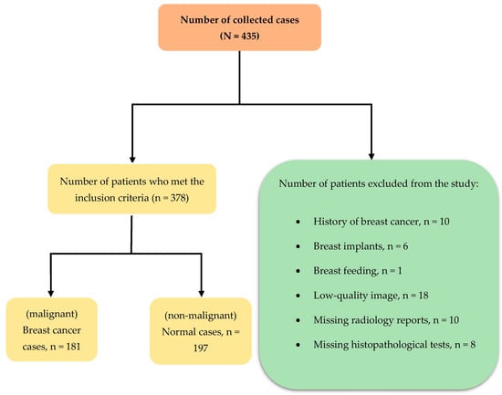 The inclusion criteria for all cases were women aged > 40 years who had undergone screening digital mammographic examinations. The exclusion criteria were patients who had undergone breast reduction or implant augmentation, were currently breastfeeding, had a history of breast cancer, or had received post-neoadjuvant chemotherapy. The flowchart of the selection of the study population is shown in Figure 1.