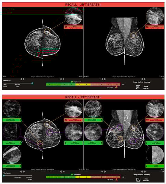 The pre-processing steps for the MammoScreen software package have a selection algorithm from DICOM tag; typical screening images are selected for CC and MLO views. If multiple CC or MLO views are found for the same patient, the most recent images were used with the assumption that the most recent images should have the best quality. By delivering a visual report summarizing the algorithm’s results, the system accepts the CC and MLO views for each breast as inputs and outputs the location of the lesions with a suspicion score ranging from 1 (benign) to 10 (malignant). The closer the score to the extremes (1 or 10), the more certain the estimate [30]. The MammoScreen software detects and characterizes suspicious findings on a screening mammogram, as illustrated in Figure 2. Lesions are categorized into three main categories: red (7–10), highly suspicious lesions; yellow (5–6), lesions suspected of malignancy; and green (1–4), lesions with low suspicion. Green lesions are not displayed by default on the MammoScreen interface; these lesions can be displayed using the filtering button at the bottom left corner of the interface.