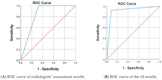 The data were analyzed using the statistical package of social sciences (SPSS) program (Version 25). After the normality homogenous test, the parametric variables identified were expressed in descriptive statistics, namely frequencies, percentages, and mean ± standard deviation (SD). A cross-tabulation test was used to calculate the sensitivity, specificity, positive predictive value (PPV), negative predictive value (NPV), and accuracy. In addition, the area under the receiver operating characteristic (AUROC) curve was used to test the differences between the AI system’s and radiologists’ assessment scores. The confidence intervals (CIs) were considered at 95%, and a p-value of <0.05 was considered statistically significant.