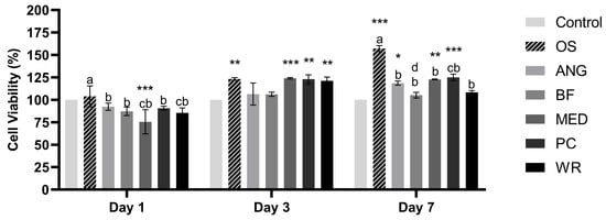Viability of MSCs under tested calcium silicate-based materials. Different letters indicate a significant difference between the test groups (p < 0.05) excluding the control group. Asterisk indicates difference between the control group and another group *** p < 0.001, ** p < 0.01, * p < 0.05. (OS: Osteogenic medium, ANG: MTA Angelus, BF: BIOfactor MTA, MED: Medcem MTA, PC: Pure Portland Cement, WR: Well-Root ST).