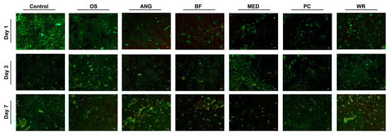 Images obtained with live/dead assay supported the MTS findings as indicated by the clear visualization of the green-stained live cells whereas red-stained dead cells were less frequently observed (Figure 2).