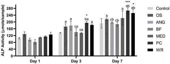 ALP activity of MSCs treated with tested calcium silicate-based materials. Different letters indicate a significant difference between the test groups (p < 0.05) excluding the control group. Asterisk indicates difference between the control group and another group *** p < 0.001, * p < 0.05. (OS: Osteogenic medium, ANG: MTA Angelus, BF: BIOfactor MTA, MED: Medcem MTA, PC: Pure Portland Cement, WR: Well-Root ST).