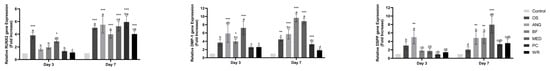 DMP-1 expression was significantly increased in MTA Angelus, Medcem MTA (p < 0.001), and BIOfactor MTA (p < 0.05) on day 3. Osteogenically induced cells expressed significantly higher DMP-1 only on day 7. On the same day, all tested materials expressed significantly higher DMP-1 except for Well-Root ST and Pure Portland Cement, which indicated a similar DMP-1 gene expression with the control group without any significant difference. BIOfactor MTA and Medcem MTA groups demonstrated a nearly 8 to 10-fold increase for DMP-1 expression at the end of cell culture, a higher increase than the osteogenic group.