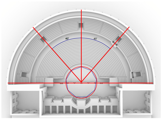 According to previous architectural research studies [9], the layout of the cavea in the theatre of Gubbio is based on a nonagon, as shown in Figure 1. This scheme is against the 12-sided regular polygon proposed by Vitruvius, which is not the dominant geometry in theatre design [11]. If a nonagon is the main geometry, the angle between staircases is approximately 40° [12]. This construction determines a shorter distance between actors and spectators. However, the lower part of the seating area is divided into four wedged sectors, while the length of the cords is divided by two, with a total number of eight sectors.