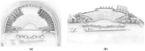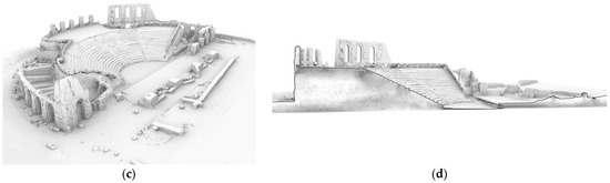 Starting with a 3D laser scanner, two digital models were created: one reproducing the existing condition and another reflecting the original Roman era form. The digital model referencing the existing conditions was created based on a survey of the site using a laser scanner [17], a popular method for the capture of 360° panoramic 3D coordinates of different points on a site. The geometric measurements were taken in June 2020. Laser pulses measure the distance between the device and the target. The data collected during this type of geometric measurement consist of a point cloud, from which the reconstruction of the theatre was obtained in combination with 2D drawings [18]. The digital reconstruction of the original shape, on the other hand, was based on archaeological findings.