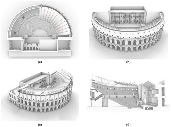 The 3D model related to the original reconstruction of the Roman theatre of Gubbio: plan layout (a), front view (b), perspectival view (c), and transversal section (d).