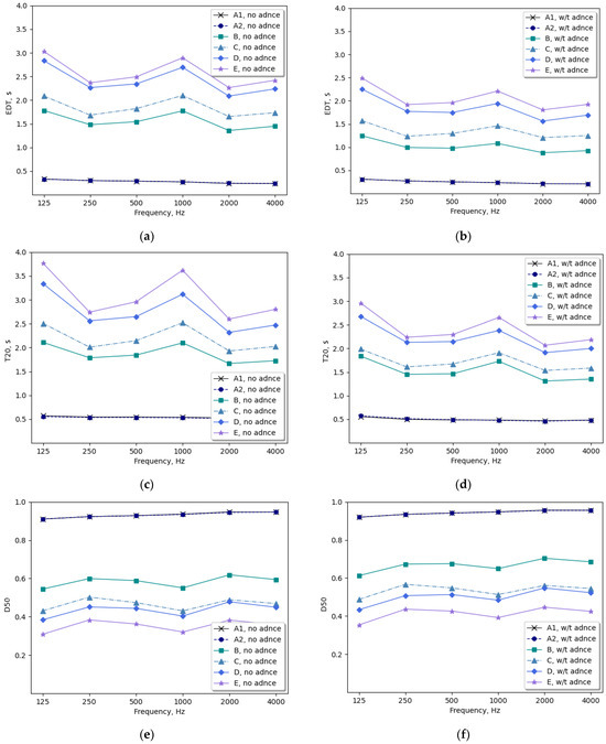 Comparison of scenarios A to E applied to the Roman theatre of Gubbio in relation to the acoustic parameters: EDT without audience (a), EDT with audience (b), T20 without audience (c), T20 with audience (d), D50 without audience (e), and D50 with audience (f).