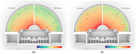 Spatial distribution of strength (G) at 1 kHz, with and without audience: scenario A1 (a), scenario A2 (b), scenario B (c), scenario C (d), scenario D (e), and scenario E (f).