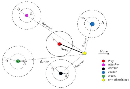 where and are random vectors in the range of [0, 1], respectively; f is a convergence factor whose value decreases nonlinearly from 2.5 to 0 with an increasing number of iterations; a is a random vector determining the distance between chimpanzees and prey with a random number in the range of [−f, f]; m is a chaotic mapping vector representing the effect of neutral motivation of chimpanzees during hunting; C is a chimpanzee control coefficient of prey expulsion and chasing, whose value is a random number in the range of [0, 2]. After population initialization, the four optimal solutions are selected as the positions of attacker, obstacle, repeller, and chaser, in turn, and the other chimpanzee positions in the population are updated around the following four chimpanzee positions, which are described by the mathematical model shown in Equations (6)–(9):