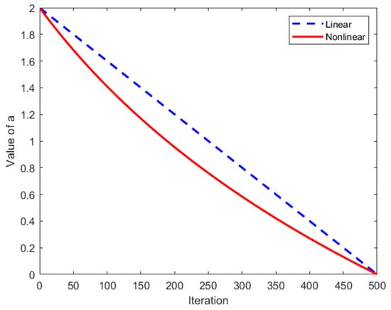 where t is the current number of iterations and Maxiter is the maximum number of iterations. ainitial and afinal are the initial and final values of a, respectively, and the values in this paper are 2 and 0, respectively. Figure 2 presents a curve comparison between the linear decreasing strategy of parameter a and the proposed nonlinear decreasing strategy.