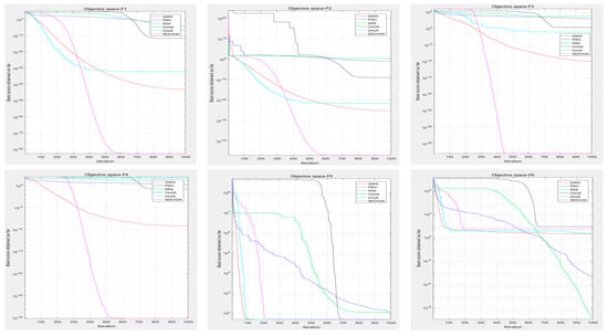 To reflect the dynamic convergence characteristics of SDChOA, as shown in Figure 4, both ChOA and IChOA were used to solve the single-peaked function when F1–F4. Its search accuracy is at least 100 orders of magnitude and 30 orders of magnitude higher than the standard ChOA, respectively. This is attributed to the adaptive location update and dynamic weighting strategy that produce a more optimal solution to guide the population to find the global optimal solution stably, improving the convergence accuracy of the algorithm. At the same time, the “attacker” individuals lead the population to a larger prey search range to find the optimal solution, which helps the algorithm to jump out of the local optimum while maintaining the population diversity, and the nonlinear adjustment of the convergence factor based on the logarithmic function balances the local and global exploration capabilities. Specifically, SDChOA outperforms other comparative algorithms in search performance at the beginning of the iterations and exploration performance at the end of the iterations, with higher solution accuracy and faster convergence speed under the same number of iterations. This indicates that SDChOA can fully guarantee exploration ability without losing population diversity and stability of prey search while ensuring exploration ability.