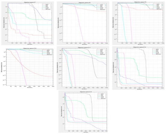 The optimal value and the mean value are used to reflect the ability and convergence accuracy of the algorithm in finding the best performance. First, SDChOA obtains the optimal theoretical values when solving the F9 and F11 functions. For functions F3~F5, its shape is similar to a parabola, and there are a large number of local optimal values. At the same time, F7 is a multimodal function with a valley shape, and its global optimal value is located at the lower end of the mountain, which is difficult to find. As shown in Table 3, SDChOA outperforms other algorithms. Peak functions F1–F7 can be used to research and develop capability algorithms. According to the results in Table 3, six out of seven cases of the proposed SDChOA have the best results, with obvious advantages over competitors. Multimodal functions F8–F13 have a large number of local optima, and the global optimum becomes more difficult to obtain as the search space dimension increases. The results in Table 3 show that the proposed SDChOA achieved the optimal solution in six cases and achieved the best effect in nine cases. This shows that the proposed improvement strategy has a significant optimization effect on the standard ChOA. Integrating these strategies into the SDChOA improves its performance in terms of search accuracy and stability, showing certain advantages. In order to further compare the convergence of various algorithms in the optimization process, we drew the optimized iteration curves of the 13 algorithm processes. The convergence curves of functions F1–F13 are shown in Figure 4, which shows that SDChOA performs well in most of the following aspects.