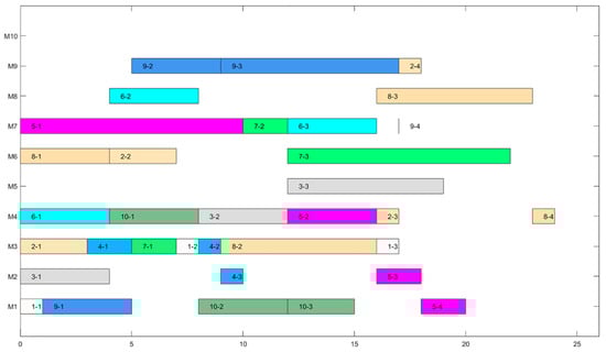 Figure 5, Figure 6 and Figure 7 show the Gantt charts for obtaining better solutions for the three example problems listed in Table 5, respectively. As shown in Figure 8, the convergence speed and parameters of the new SDChOA proposed in this paper are tested for the 8 × 8 flexible job shop problem examples with one objective value of maximum completion time minimization and the same parameters as those set earlier. The test results show that the new improved hybrid improvement strategy of the Chimp optimization algorithm proposed in this paper to solve the flexible job shop scheduling problem significantly improved the quality of the initial solution and the quality of the solution, and the convergence speed also improved significantly.