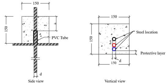 In this paper, four test variables—concrete strength, anchor length, reinforcement diameter and concrete cover thickness—were selected. The test pieces were designed for 38 groups, as shown in Table 1. In the pieces, the ordinary steel bars embedded in ordinary concrete were named OS-OC, while the ordinary steel bars embedded in hybrid fiber-reinforced concrete were named OS-HFRC. The reinforced concrete specimens were standard cubes with the following dimensions: 150 mm × 150 mm × 150 mm. The lengths of the steel bars were 500 mm, the free-end lengths were 50 mm and the loading end lengths were 300 mm. A test piece is shown in Figure 1.