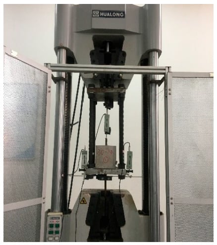 The pull-out tests were conducted in accordance with the relevant provisions regarding the bond strength tests of concrete and reinforcement in the “Standard for test methods of physical and mechanical properties of concrete (GB50081-2019)” [10]. Central pull-out tests were conducted using the WE-100 universal material testing machine. The loading rate was controlled based on the displacement speed of the test bench, initially at 0.3 mm/min until the drawing force fell to 50% of the peak value, after which it increased to 0.6 mm/min until the end of the test. The displacement of the free end and loading section of the steel bars should be measured using an LVDT with a range of 50 mm, and the load changes during the tests should be directly recorded by the computer. A diagram of the test setup is presented in Figure 4.
