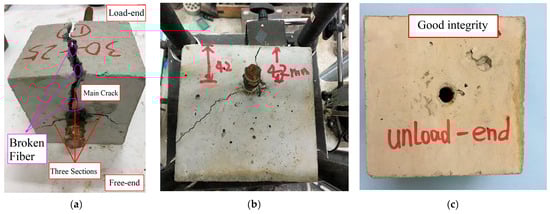 The tensile strength of concrete is lower than that of steel bars. During the drawing process, the steel bars have not yet reached the yield stage. In contrast, the concrete had already reached its ultimate tensile strength, exhibiting distinctly brittle failure characteristics, as shown in Figure 5a. Figure 5b depicts splitting shear failure, a form of bond anchoring failure between steel bars and concrete. Throughout the loading process, the load escalates rapidly with slip, and concrete splitting failure occurs in the horizontal or descending section of the load–slip curve. However, in contrast to splitting failure, the load does not suddenly plummet to zero, and the specimen retains a specific load-bearing capacity at a later stage. Figure 6c shows the steel bar pull-out failure, an ideal failure mode that allows for the acquisition of the complete process curve of the bond slip. Throughout the loading process, both the free end and loading end slip incrementally with the increasing load, resulting in a relatively steep slope of the bond–slip curve. Upon reaching the ultimate load, the steel bars are gradually pulled out, inducing a shear slip between the steel bars and the concrete along the longitudinal direction of the steel bars, leading to a failure pattern resembling a plough. The pulling process is relatively slow, with the load also reducing to approximately 20% of the peak load and stabilising thereafter.