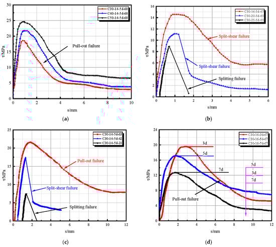 The curves for the different steel bar diameters are illustrated in Figure 6c. The thickness of the reinforcement protective layer dictates the restraint effect of concrete on reinforcement. A thicker protective layer results in a less pronounced crack development. When the thickness of the protective layer is minimal, the restraint on the expansion of cracks is not effectively inhibitory, allowing the cracks in the rib to propagate to the concrete surface prematurely, leading to a splitting–shear failure. Conversely, a thicker protective layer exhibits a more significant inhibitory effect on crack development, and accordingly, experiences a higher bonding stress.