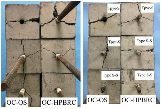Figure 7 depicts the failure morphologies at the interfaces between steel bars and ordinary reinforced concrete (OC) and hybrid fiber-reinforced concrete (HPBRC) specimens. The ultimate failure mode of the conventional concrete specimens predominantly involves splitting failure (S-type), characterised by a loud splitting sound, swift load reduction, and the specimens being divided into two or three pieces. In contrast, the hybrid fiber-reinforced concrete specimens exhibited superior toughness and ductility, with their failure mode primarily manifesting as splitting–shear failure (S-S type). Upon concrete splitting failure, the load rapidly decreases but the specimens’ primary maintain integrity and retain a certain degree of load-bearing capacity.