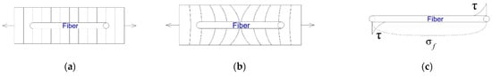 Tensile behavior and stress distribution of fibers in cement-based matrix. (a) Before loading; (b) after loading; (c) shear and tensile stresses of fibers.