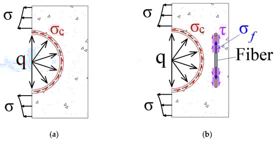 The primary cause of the impairment of the bond between steel bars and OC is the radial component of oblique extrusion pressure q, which induces cyclic tensile stress σc in the surrounding concrete. Once σc surpasses the concrete’s ultimate tensile strength, the concrete fractures immediately, resulting in a rapid decline in bond stress (Figure 9a). The radial component q of transverse costal oblique compression pressure is jointly resisted by the annular tensile stress σc of the concrete and the shear stress τ of the fiber and cement base (Figure 9b). As previously reported [11], adding fibers can effectively enhance the concrete’s ultimate tensile strength, deflection deformation capacity and peak ductility.