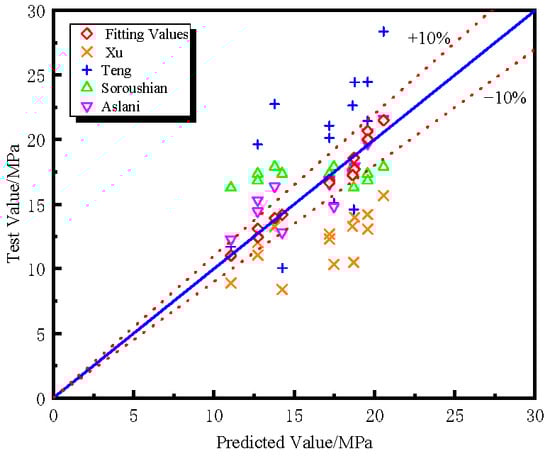 The comparison between fitting and test results is shown in Figure 11, and compared with the prediction model [12,13,14,15]. The fitting results agree well with the test results, and the vast majority of errors are within ±10%, as shown in Figure 11. It indicates that the ultimate bond strength calculation type is well fitted, which can effectively predict the ultimate bond strength of deformed bars and hybrid fiber-reinforced concrete.