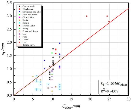 The adequacy of the concrete protective layer to provide restraint or equivalent functionality to stirrups determines the mode of bond failure, which commonly presents as pull-out failure. In this scenario, the concrete between the steel bars is completely severed or crushed. The bond stress is primarily determined by the shear strength of the concrete, rather than the splitting capacity of the protective layer. Consequently, the additional restraint provided by the concrete cover or stirrups has a limited impact on the bonding behavior. Thus, the variable s1 in the failure mode of steel bar shearing and pull-out is dictated by the spacing of the steel bars’ transverse ribs. The modifications in peak slip s1 and the spacing Cclear of the steel bars’ transverse ribs based on the previous test data are depicted in Figure 12.