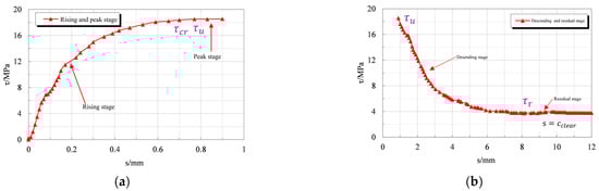 It can be seen from Figure 14 that the bond stress of the specimen drops significantly after the peak. Due to the rapid crack development after the peak, the bond stress decreases exponentially. The hoop force generated by the balanced mechanical occlusion is hardly assisted by the lateral restraint when the crack propagates through the concrete cover. However, since the internal cracking of the concrete does not immediately lead it to lose tensile properties, the specimen can still maintain a certain residual bond strength. Therefore, the relationship between bond stress and slip after the peak value can be found by adopting Equation (9):