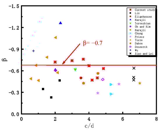 The effect of c/d on β is shown in Figure 14. We can see that the data have a large discreteness. This is mainly due to the fact that the descending section of the specimen without the transverse descends quickly, and the data points are not easily captured, which will lead to test errors. Generally, β increases slightly with the c/d increase. Despite the cracking inside, the concrete does not immediately lose its tensile properties, thereby sustaining a specific residual bond strength. It can be determined from the test data that β = −0.7.
