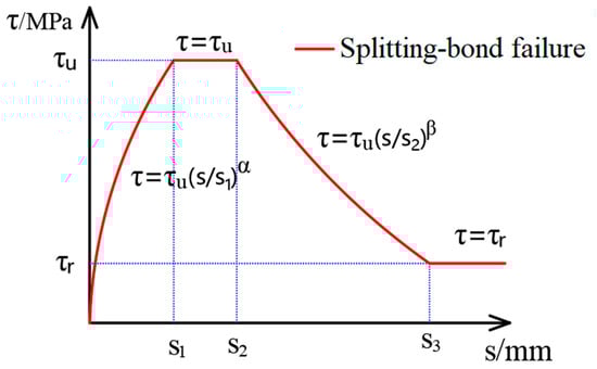 where the ultimate bond strength is represented by τu. s1 is calculated according to Equation (4). s2 = s1 + 0.2 mm; s3 = Cclear; φ = 0.3; α = 0.4; β = −0.7. The proposed bond–slip model is shown in Figure 15.