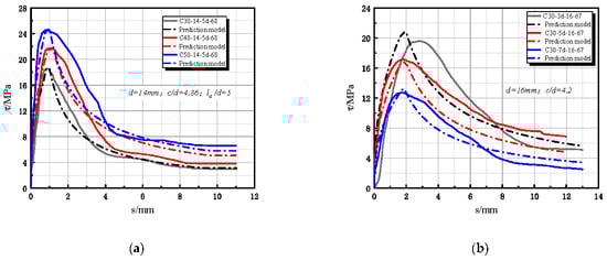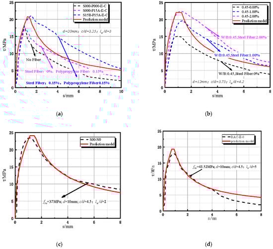 Consequently, during the initial ascending stage of the curve, the hybrid fiber makes a negligible contribution to the bond stress between the steel bars and the concrete. The descending section of the forecast model differs from the corresponding section of the measured curve. The falling portion of the measured curve is underestimated, as illustrated in Figure 16b. Cracks emerge in the concrete at this stage, and the mixed fiber at the crack is in tension. After concrete cracks, the hybrid fiber can provide a certain degree of lateral restraint, inhibiting the rapid expansion and extension of cracks. Consequently, the bonding stress does not plummet abruptly due to concrete cracking, resulting in a smoother curve. Therefore, in the descending phase of the curve, the contribution of hybrid fibers to the bond stress between steel and concrete is underestimated. As a result, the descending segment of the prediction model differed from the descending segment of the measured curve.